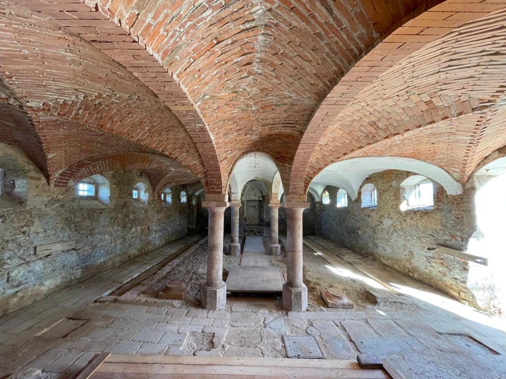 Backsteinkeller mit Ziegelgewölbe in dem Käse gelagert wird. Bausubstanz: aus Ton gebrannte Ziegelsteine in Reichsformat. Brenntemperatur ca. 950 C – Weich -und Mittelbrand. Kein Hartbrand! Ziegelsteine sind auf Kalkmoertel verlegt.